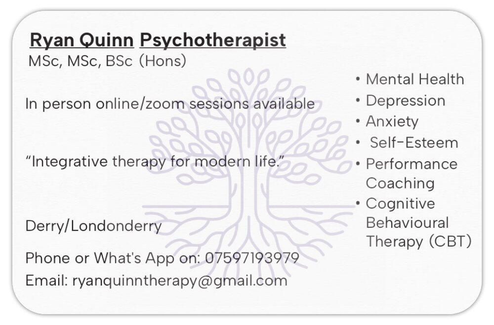 Hi, I’m Ryan Quinn, a psychological therapist based in Derry/Londonderry. I support people dealing with anxiety, low mood, self confidence, depression and the impact of difficult life experiences. My approach is calm, supportive, and focused on understanding what’s really going on beneath the surface. Together, we look at patterns of thoughts and feelings, to find healthier ways to cope, and to build a stronger sense of balance and self-trust.